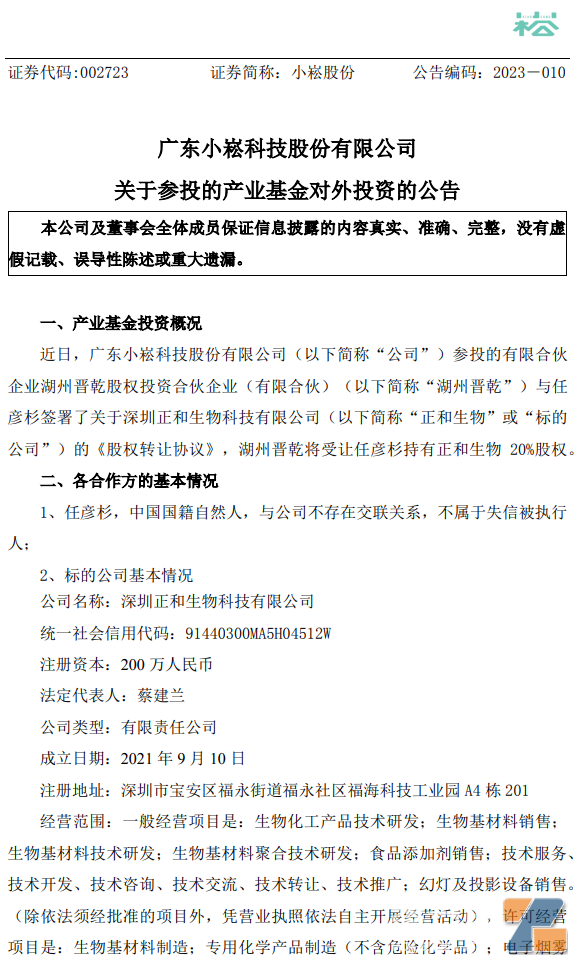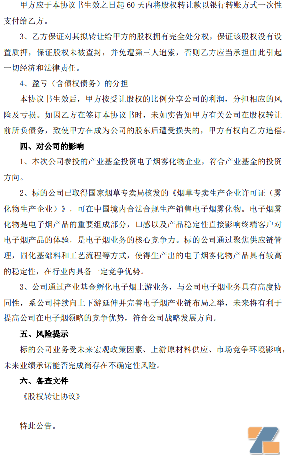 1月10日晚,小崧股份(002723.SZ)发布公告,公司参投的产业基金湖州晋乾股权投资合伙企业(有限合伙)(简称“湖州晋乾”)近期签署了对电子烟雾化液供应商深圳正和生物科技有限公司(简称“正和生物”)的《股权转让协议》,湖州晋乾将持有正和生物20%股权。这标志着小崧股份在电子烟全产业链上布局再落一子,同时也体现了公司坚定发展电子烟产业的信心与决心。
