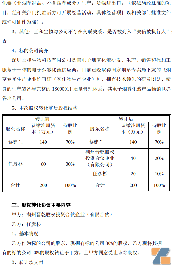 据公告披露,正和生物是集电子烟雾化液研发、生产、销售和代加工服务于一体的电子烟雾化液供应商,并已取得国家烟草专卖局核发的《烟草专卖生产企业许可证(雾化物生产企业)》,可在中国境内合法合规生产销售电子烟雾化物,在行业内具备一定竞争优势。