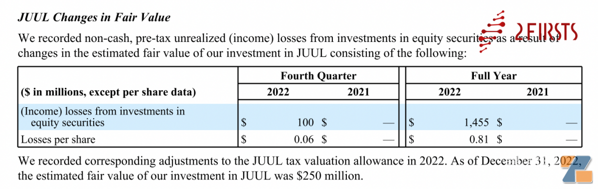此外,奥驰亚集团还修改了其在 JUUL Labs 的股份估值。据奥驰亚称,截至2022年12月31日,这笔投资价值2.5亿美元。