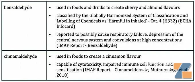 在澳大利亚电子烟标准TG110中,肉桂醛和苯甲醛被明确列为禁用物质。该标准还写明,肉桂醛与苯甲醛分别被欧洲化学品管理局(ECHA)和美国食品药品监督管理局(FDA)报告为有害物质,肉桂醛在高浓度时摄入可能引起呼吸衰竭、中枢神经系统抑制和惊厥;苯甲醛则具有细胞毒性,可导致免疫细胞功能受损和致敏作用。