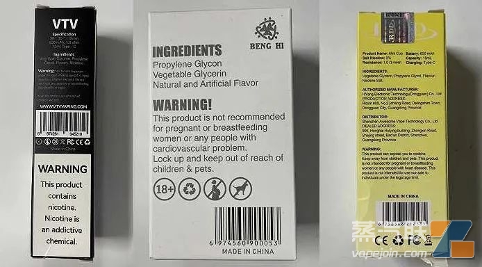另有两款产品,测出含有肉桂醛与苯甲醛成分,这是两种常见的芳香醛物质,分别用于模拟肉桂味道和杏仁味道。不过,它们都不是电子烟国家标准中被允许的添加物。