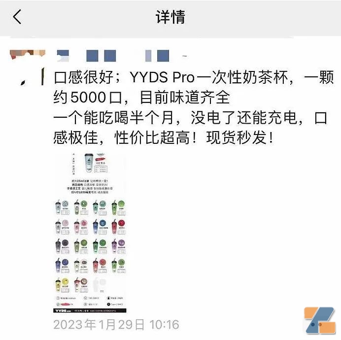 一次性奶茶杯电子烟,就是其中最受欢迎的产品。在线下门店,仍有店主暗中售卖奶茶杯;在线上微商等渠道,奶茶杯也是热门产品,朋友圈中充斥着不少海报。微博上,“奶茶杯”超话主页已有1389.4万阅读,5300篇帖子,绝大部分内容是在线求购和微商广告。