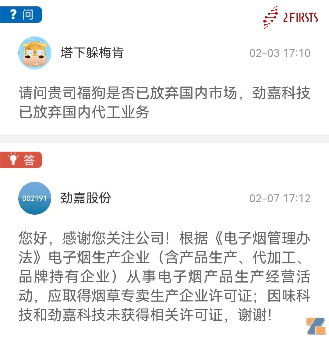2月7日,劲嘉股份回答:根据《电子烟管理办法》电子烟生产企业(含产品生产、代加工、品牌持有企业)从事电子烟产品生产经营活动,应取得烟草专卖生产企业许可证;因味科技和劲嘉科技未获得相关许可证。