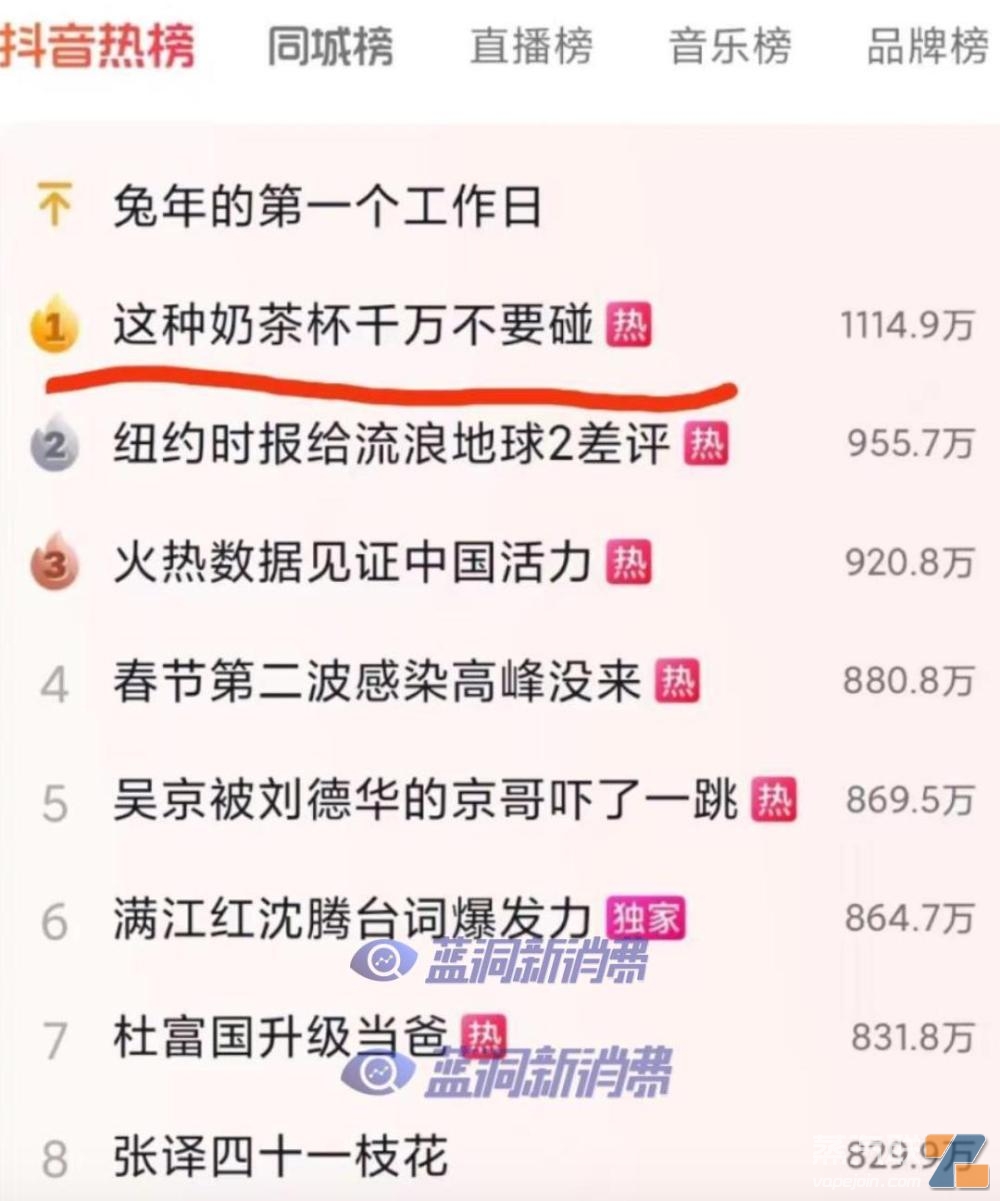 1月28日,春节长假结束开工第一天,「奶茶杯电子烟有害」话题登顶抖音热榜总榜第一。