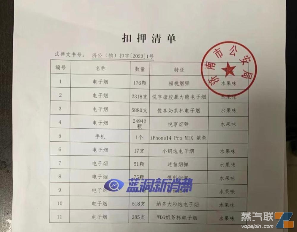 扣押清单一共包括11款水果味电子烟,以及一部苹果手机。