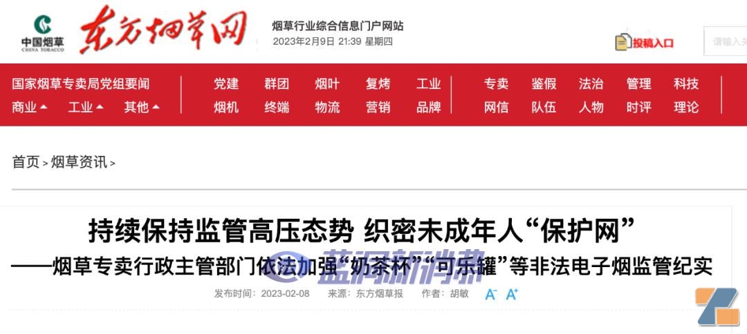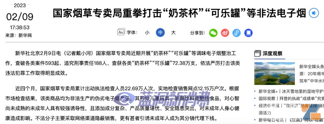 烟草业内权威官方媒体东方烟草报也在2月8日发布了《烟草专卖行政主管部门依法加强奶茶杯可乐罐等非法电子烟监管纪实》文章,详细今日消息了近期各地电子烟扫非案件情况。