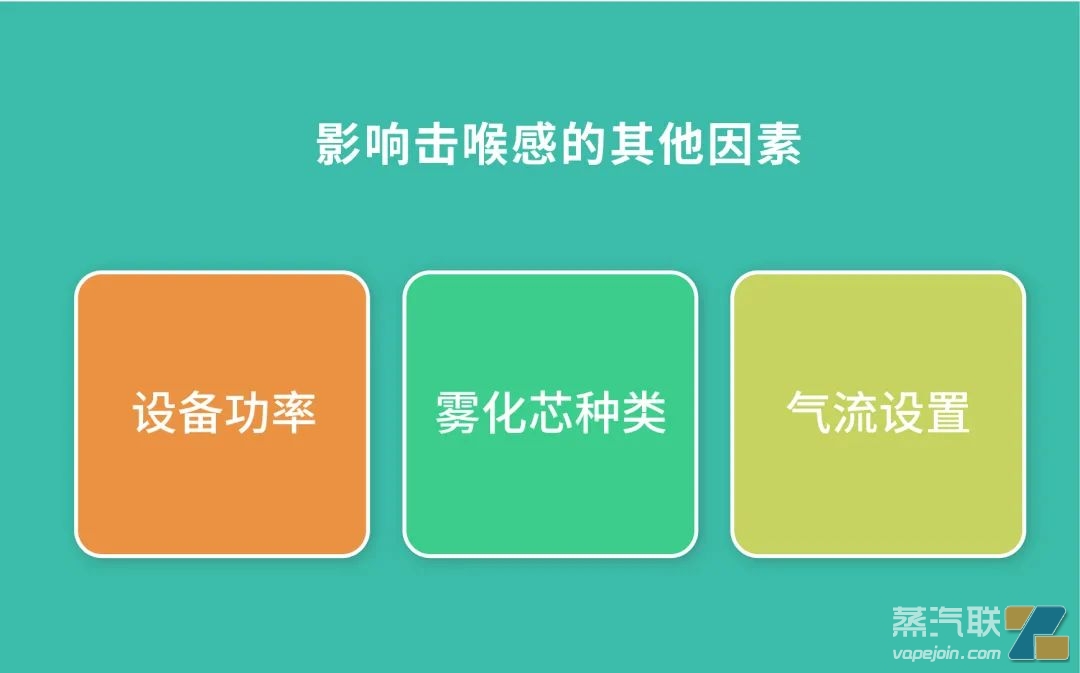 另一个重要的影响因素就是雾化芯种类。当雾化芯的电阻较低时,线材较粗,更高的电流通过可以带来更高的温度,继而产生量更大、温度更高的雾化烟雾,造成更强烈的击喉感。