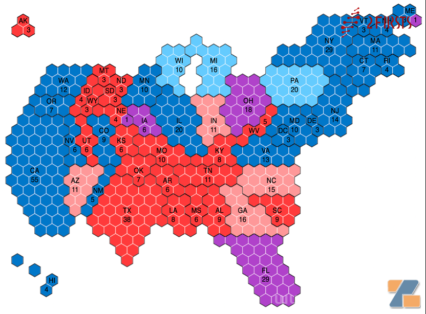 图1 2008-2020四次总统选举的红蓝州加权分布图,蒙大拿为深红州,佛罗里达州中立摇摆 来源:wiki