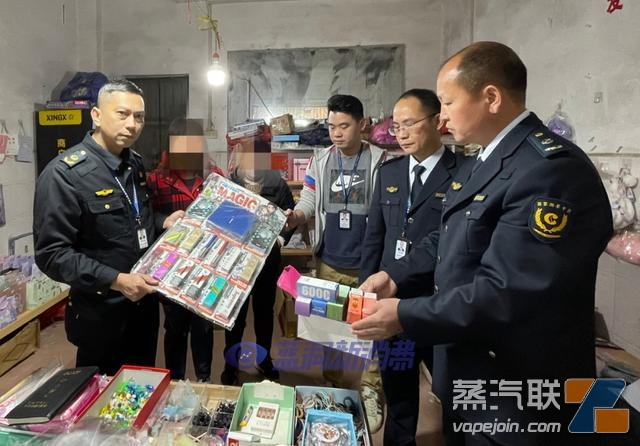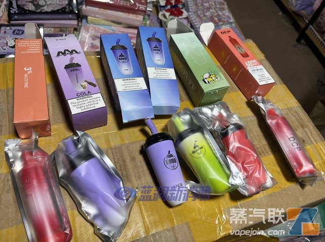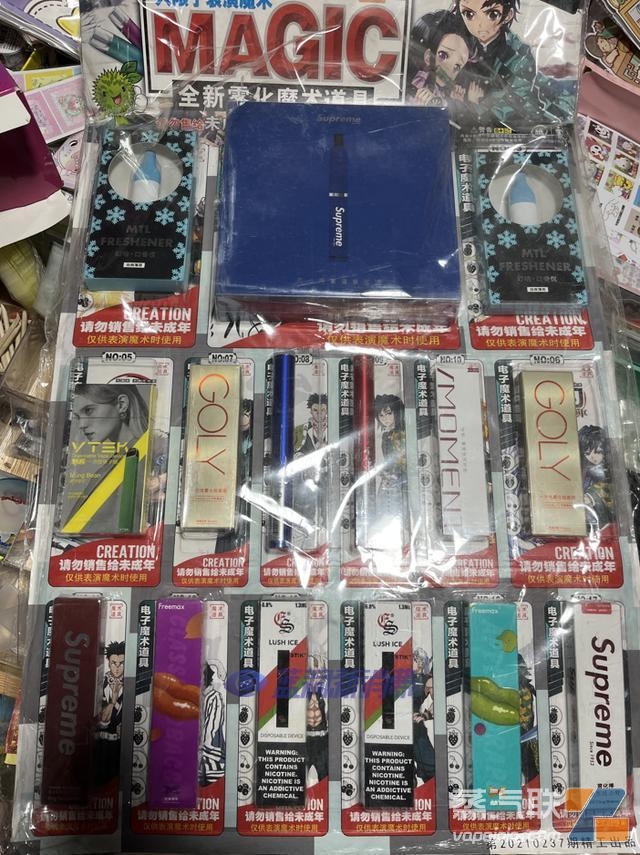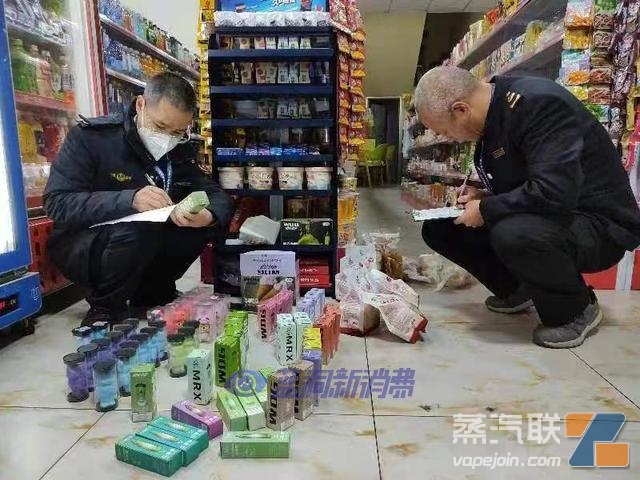 “当天,我局和县烟草局的8名执法人员分成两个小组,同时进入两家小卖部进行检查。”该负责人介绍,检查中,执法人员发现两家小卖部均办理了营业执照,但均未办理烟草专卖零售许可证。其中,一家小卖部收银台后的黑色塑料袋里发现7个“奶茶杯”调味电子烟,另一家小卖部货架下的纸盒内发现6个“奶茶杯”调味电子烟和1套内装15个一次性雾化轻感烟、一次性电子烟等涉烟物品的“全新雾化魔术道具”套装。“虽然这些产品套装外包装上都标注有‘请勿销售给未成年人’字样,但来店内消费的全都是小学生。”