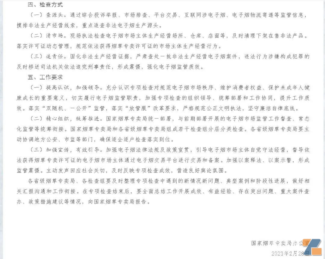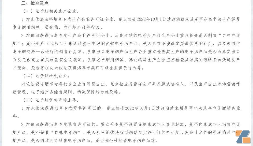 文件特别提到“对未依法获得烟草专卖生产企业许可证企业。重点检查2022年10月1日过渡期结束后是否存在非法生产经营电子烟用烟碱、雾化物、电子烟产品等行为。”言下之意就是,抓未获证企业的检查,对去年10月后的行为进行检查。