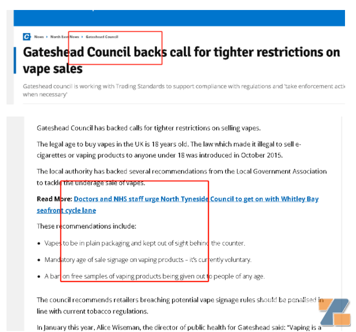 今天盖茨黑德委员会宣布支持对电子烟销售实施更严格限制的呼吁。要点:“需要减少使用vape产品的年轻人数量和可供销售的不合规产品的数量”。而盖茨黑德市议会正在与贸易标准合作,以支持遵守法规并“在必要时采取执法行动”。
