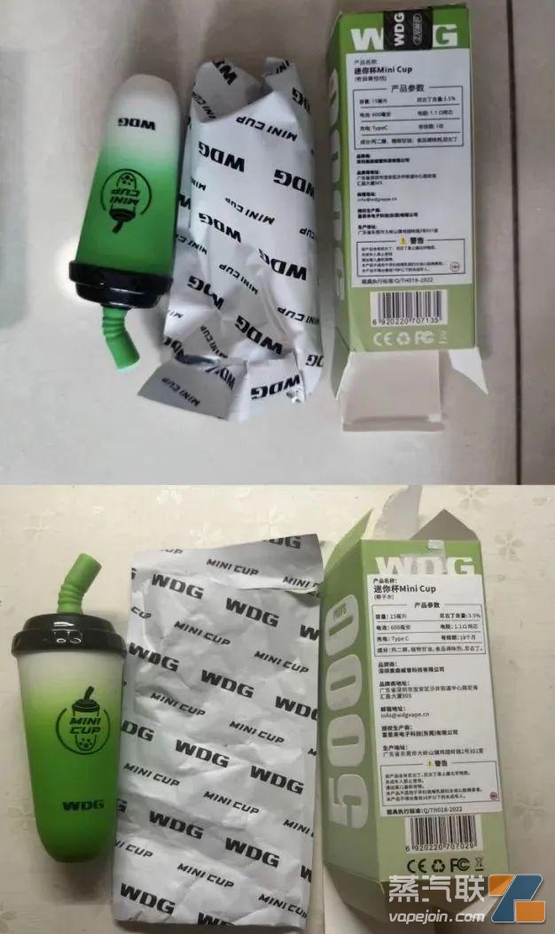2023年3月记者从厂家直购的仿制“WDG”电子烟(上),和2022年9月记者在电子烟零售店购买的同款产品(下)的包装、产品几乎一样。新京报记者 慕宏举 摄