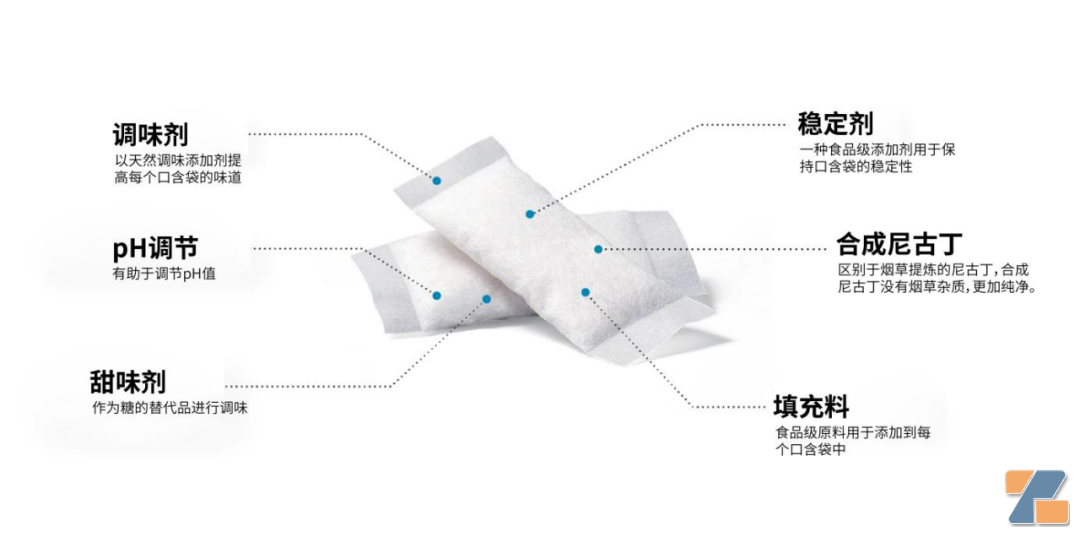 这种无烟草尼古丁袋目前成为了美国口服尼古丁产品中的主要品类。尼古丁口含袋中不含烟草成份,且通过口腔粘膜及血液更快地吸收尼古丁。不仅降低了传统卷烟及电子烟中的燃烧及雾化危害,同时打破社交限制,是一种新的尼古丁替代方案。