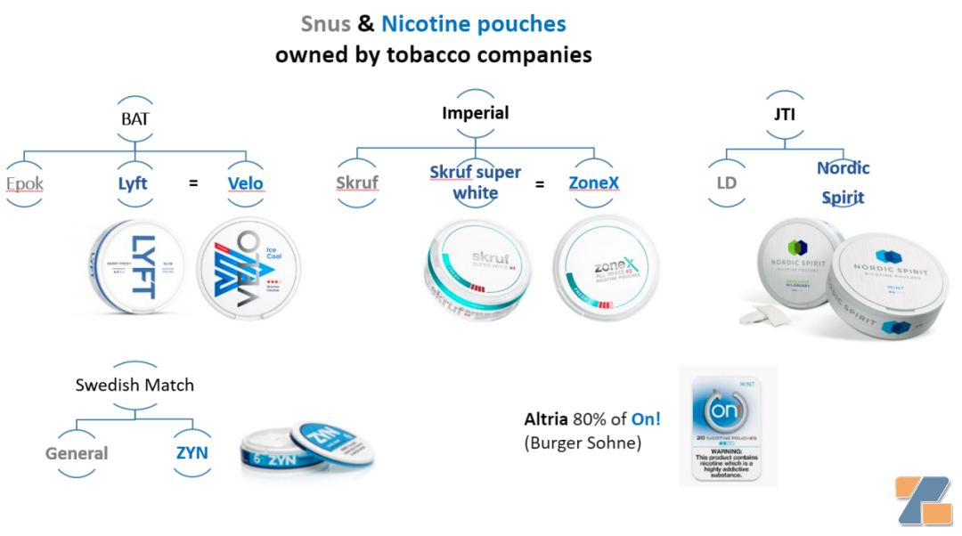目前,所谓“四大跨国烟草公司”都已经布局尼古丁袋产品线。其中份额第一的Zyn来自上面提到被PMI收购的瑞典火柴,紧随其后的on!来自奥驰亚,第三名Velo则隶属于英美烟草;帝国烟草、日烟国际也都已经各自布局了自家的尼古丁袋产品线(如下图):