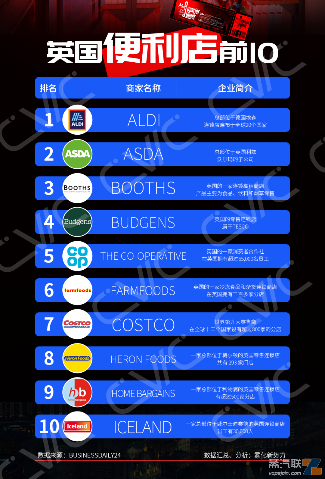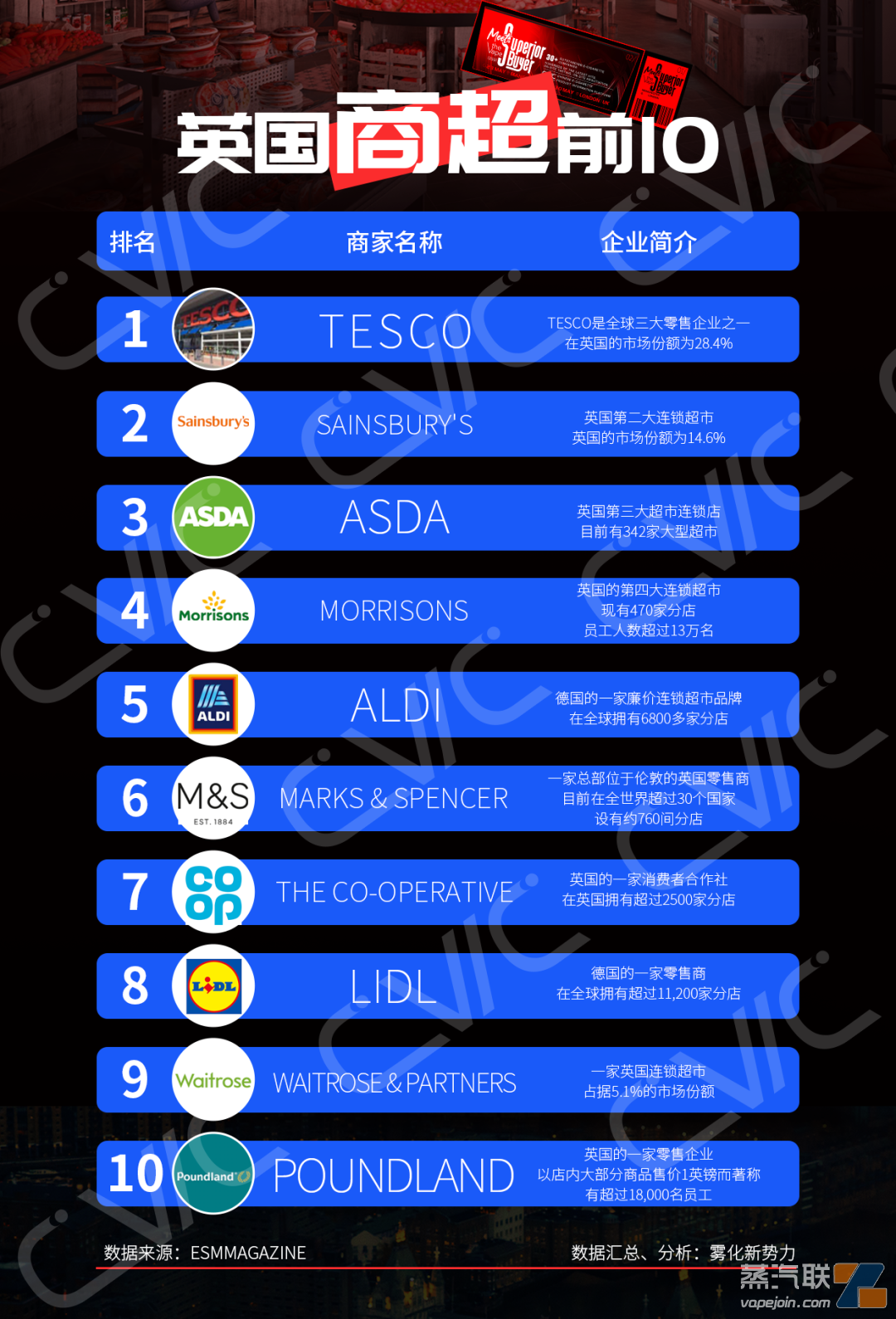 说明:英国TOP10商超较受欢迎的商家品牌为:88Vape, Aqua Vape, Blu Bar, Vuse Go, Elf Bar, Ok Vape. Evo, Smok等品牌产品。