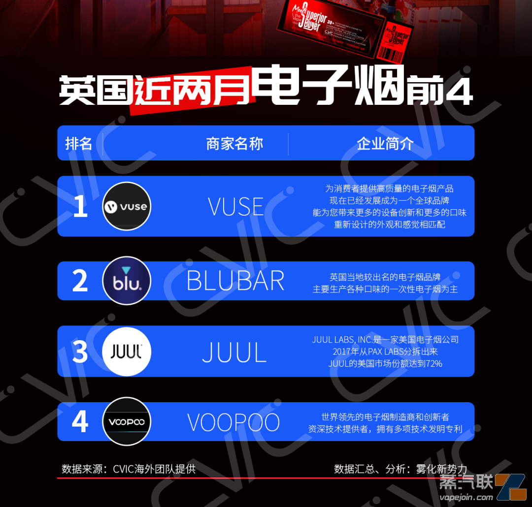 说明:英国近2个月销量电子烟品牌,合规品牌占据了主流快消品市场。