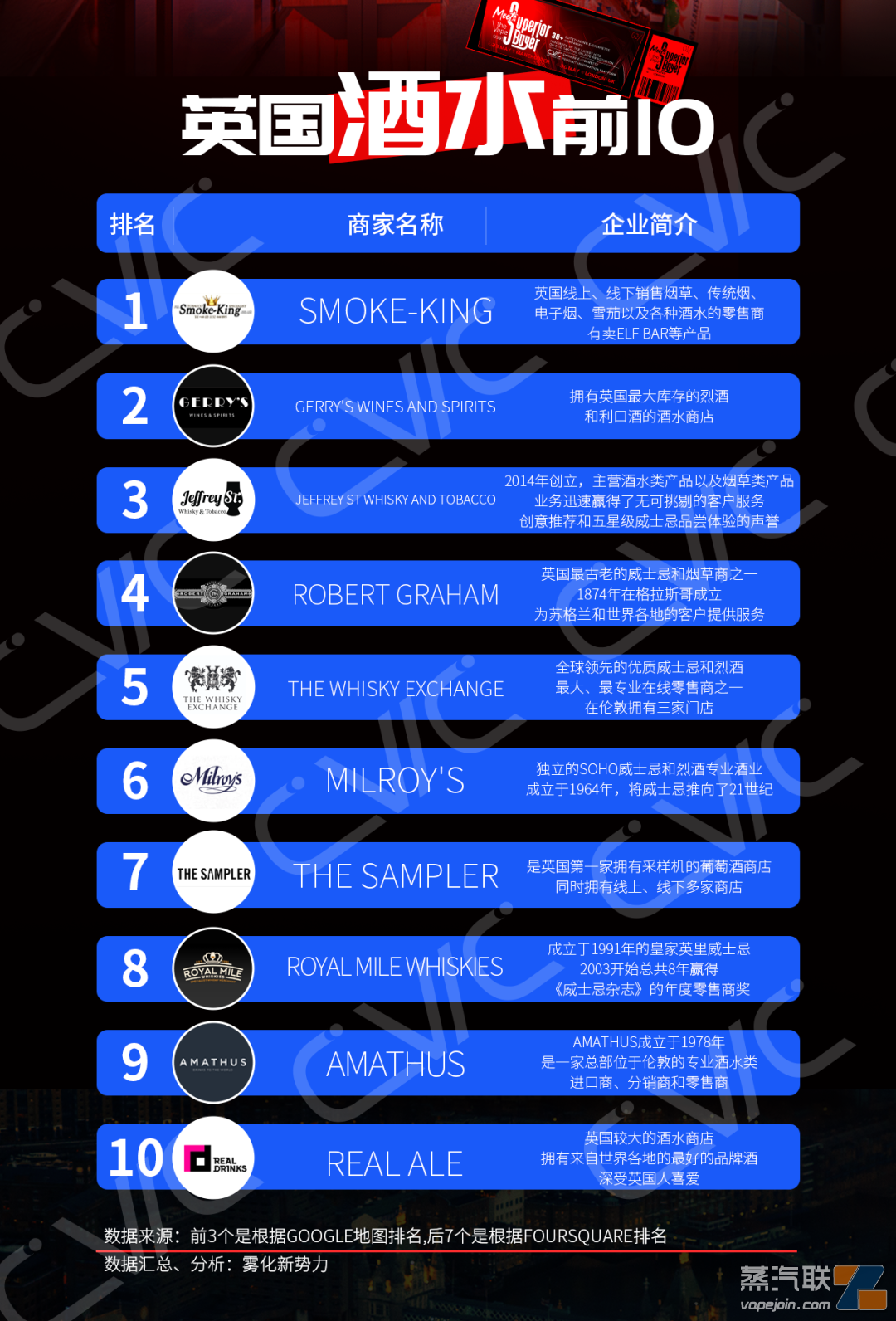 SMOKE-KING、GERRY'S WINES AND SPIRITS和JEFFREY ST WHISKY AND TOBACCO是英国排名前三的酒水商家,拥有多家门店。年轻人是酒水商店的重要消费群体,而电子烟同样在年轻群体里也很流行,因此酒水商店除了销售酒水外还会销售电子烟产品。为了更好地开拓电子烟市场,电子烟品牌需要把握好酒水这一增量市场。