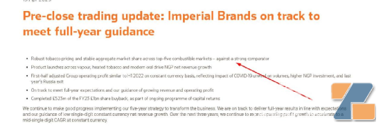 4月23日消息,近日“雾化新势力”从海外获悉,烟草和电子烟制造商帝国烟草发布公告表示,未来三年内公司预计其营业利润将加速增长。该公司在欧洲地区新型烟草2023年半年报预计收入为7400万英镑(超5个亿人民币),预计上半年新型烟草产品收入将超过去年同期。