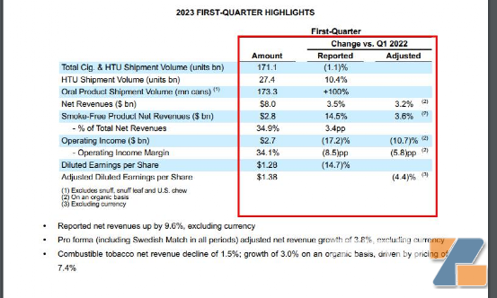 4月23日消息,近日菲利普·莫里斯国际公司(PMI)公布其 2023 年第一季度业绩。其2023年第一季度净营业收入80亿美元,同比增长3.5%。无烟产品净收入增长14.5%至28亿美元。该公司本季度的营业利润为27亿美元,同比下降17.2%。