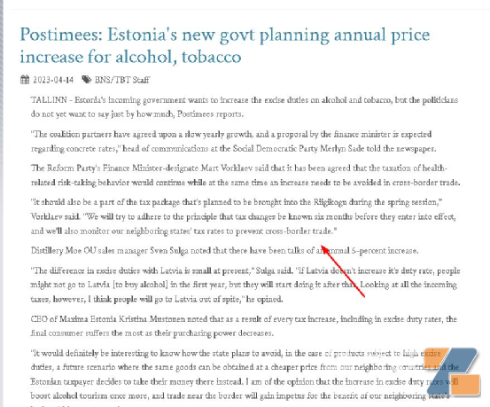 4月23日消息,近日爱沙尼亚即将上任的新一届政府内阁拟提高烟酒消费税,具体幅度尚未公布。爱沙尼亚是一个位于波罗的海东海岸的北欧国家,与俄罗斯、拉脱维亚和芬兰相邻。有烟酒行业的从业者认为,政府已经讨论过税收每年增加5%,但消费税的增加会影响购买力,可能促进边境附近的贸易。他认为,“如果拉脱维亚不提高税率,看到我们本国的烟酒税收增加,人们会去出于这个理由去拉脱维亚消费”。据行业人士介绍,他们认为消费税会影响整个行业,目前税收已占到一瓶烈性酒价格的近三分之二。
