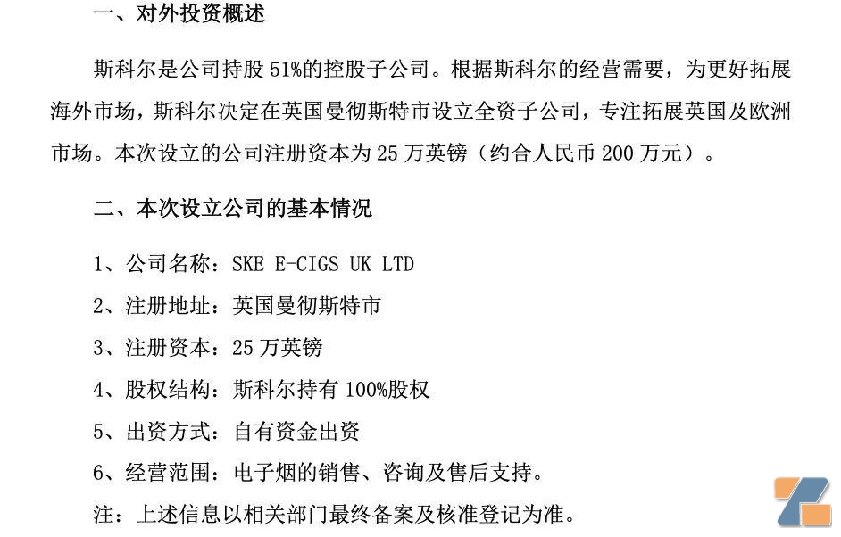 根据公开信息分析,斯科尔的快速反应,大概率与其加大了对于英国市场的投入有关。据赢合科技3月28日发布的《关于控股子公司对外投资设立英国子公司的公告》斯科尔将于英国曼彻斯特市设立全资子公司,经营范围为电子烟的销售、咨询及售后支持。