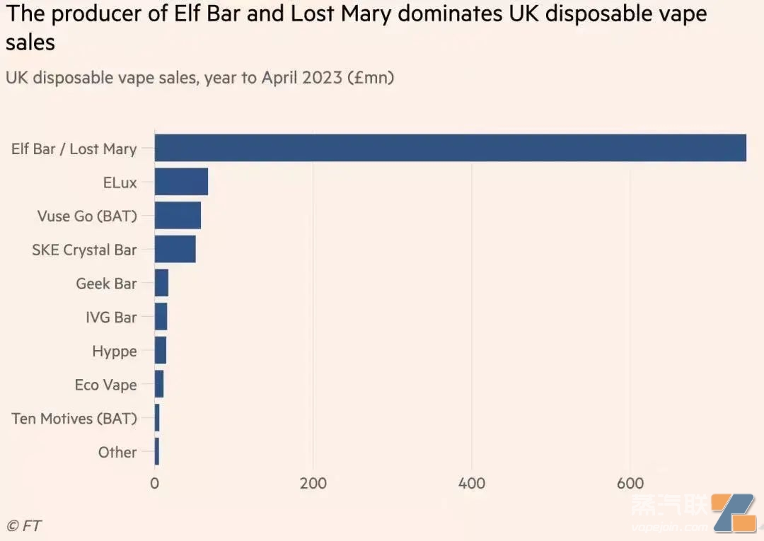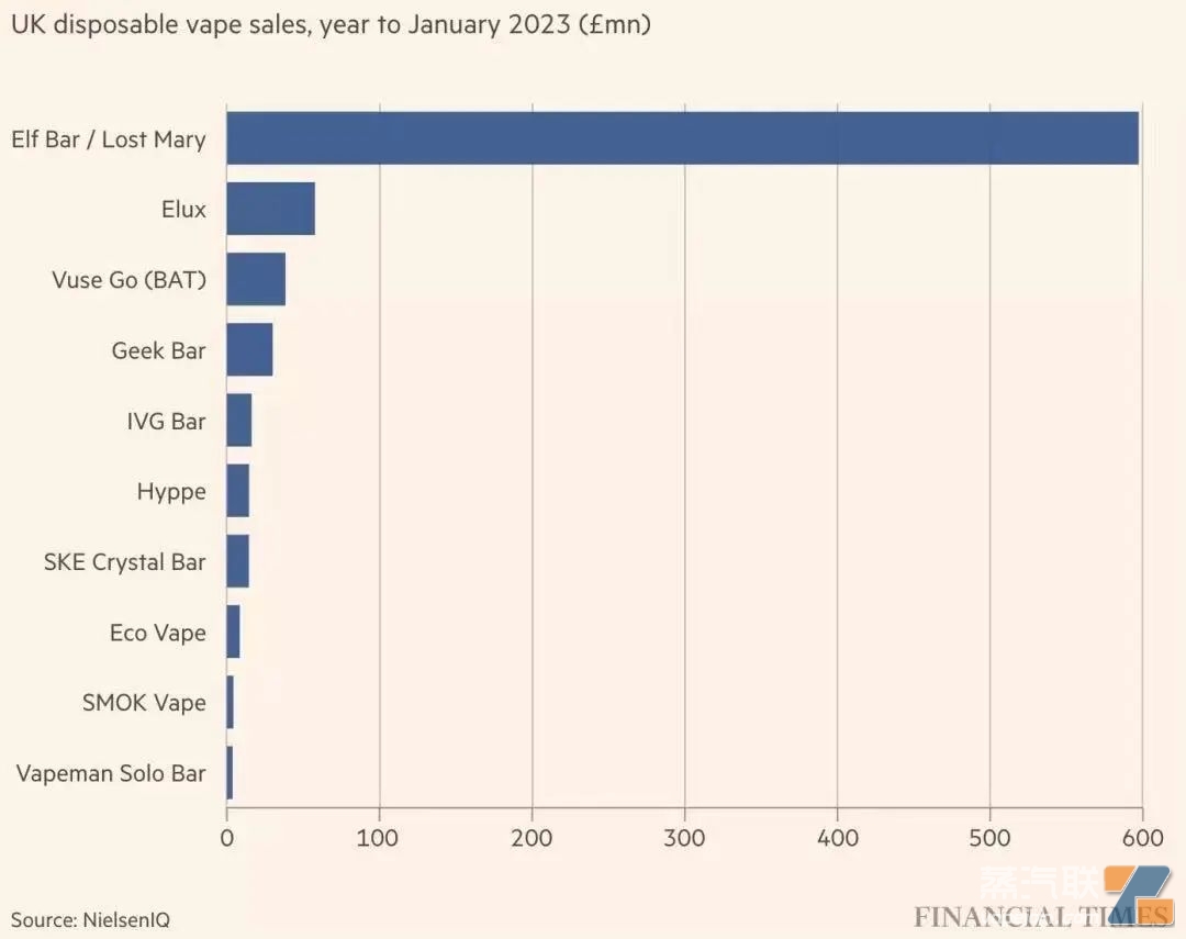 英国权威媒体《金融时报》今年两次援引调研机构数据,对英国一次性品牌按照销售额进行了排名。截止到2023年1月的数据,斯科尔旗下品牌SKE Crystal还是第七名: