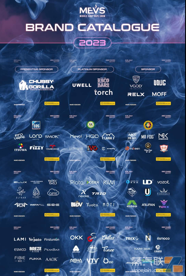 按照最新消息,90多家企业参加,其中大量的中国企业。包括UWELL、YUOTO、ELF BAR、TUGBOAT、SMOK、ELUX、RELX、KIWI、LAMI、VOZOL、MOTI、VTV、SKE、HQD、XEEK、MOFF、Vepato、PODSALT、MR FOG、Mevol、AAOK、happy bar、TOKK、firstunion、FIBIE、Aloha Sun、RINCOE、JI SHUN、OREE、DOFO、SIXHILL、LONO(劲嘉股份旗下)、VAPENGIN、ABUFAN、UD、VAPE BARS、Peak Bar、ABUFAN、Vepato等知名品牌。