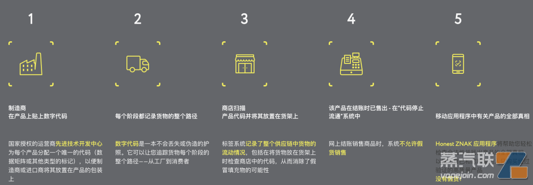 作为应对假货的主要手段。俄罗斯要求制造商、进口商、批发商、进口商必须注册该系统。打上标识的电子烟需要在每个环节扫码录入数据。