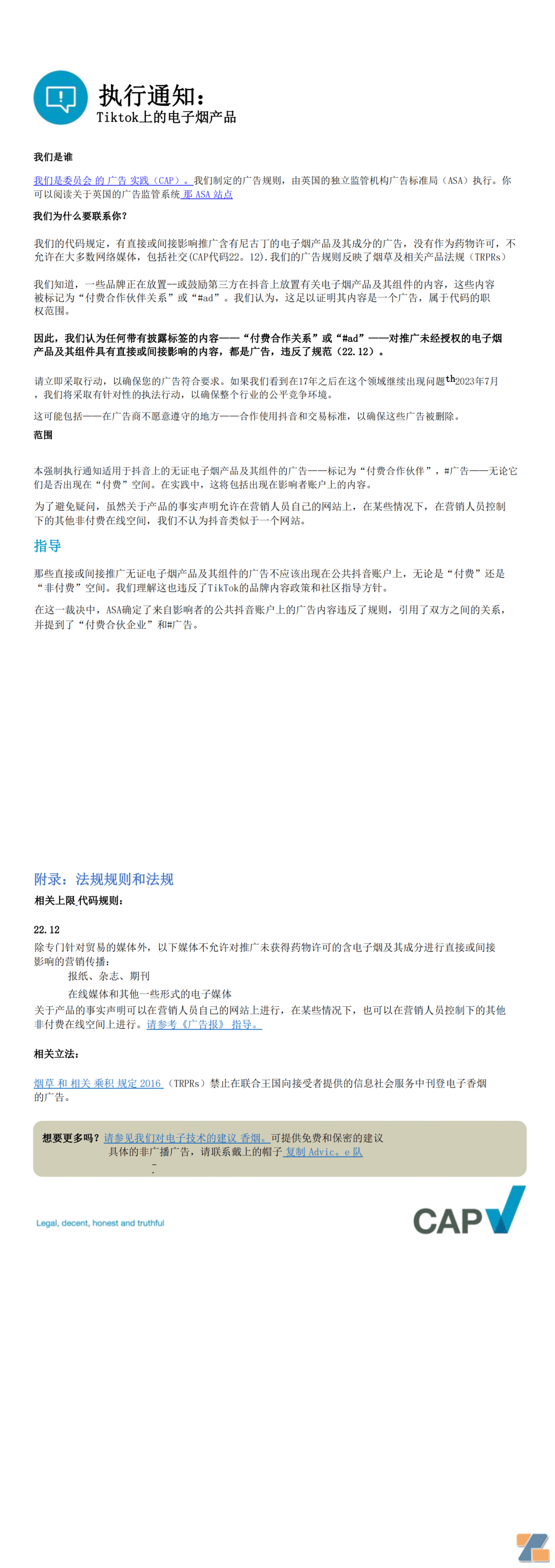 英国广告标准局(ASA)于6月29日在官网发布的《CAP就电子烟广告向行业发出执法通知》提到:执法通知将指示电子烟公司遵守广告规则,并删除社交媒体上出现的任何电子烟广告。