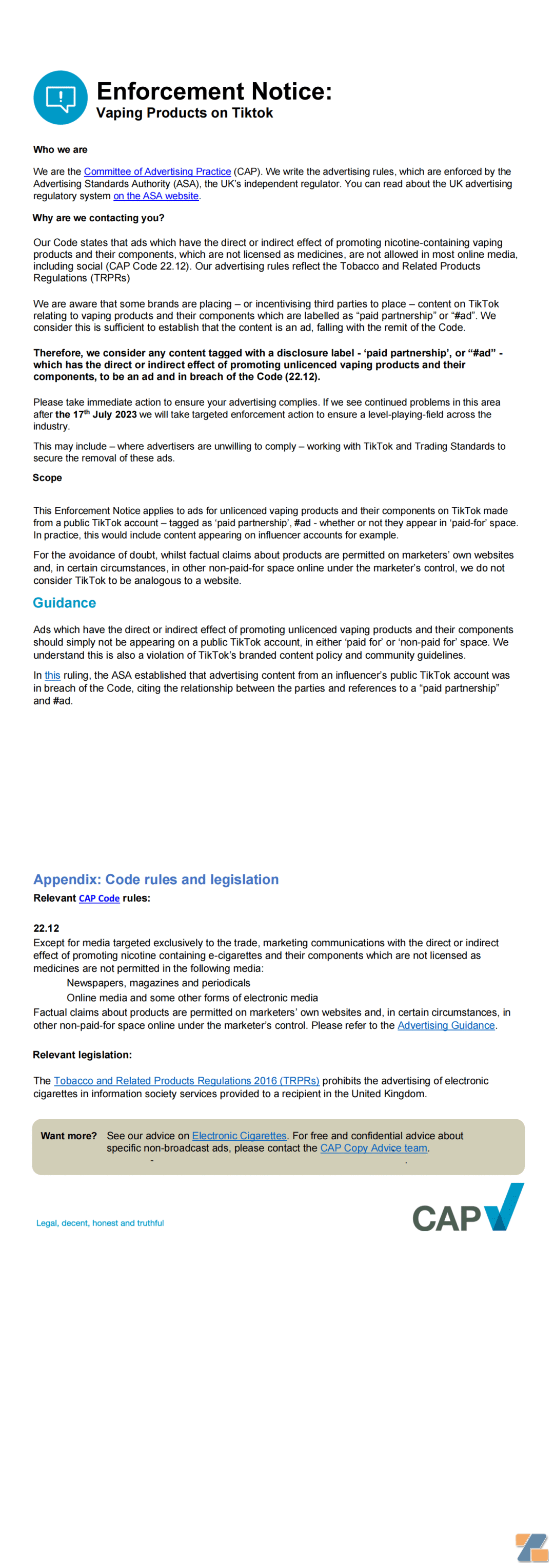 通知内容显示,英国广告实践委员会向广告商/品牌商明确了现行规定,如果他们正在使用TikTok作为电子烟广告平台,他们就必须立即停止这一行为。英国广告实践委员已经将这一问题定义为高优先级,并且正在考虑随后将采取哪些进一步行动。值得注意的是,执法并非针对所有形式的电子烟广告,英国广告实践委员会称他们的指责是确保负责任的电子烟广告仅出现在可以合法广告(面向合法的成年受众)的地方。