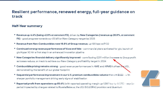 近日英美烟草(BAT)发布半年度业绩报告,在截止2023年6月30日的前六个月,其收入增长4.4%,新型烟草表现优异;非燃烧产品收入占集团总收入的16.6%;报告的运营利润增长61.4%。新型烟草的财务表现大幅改善,对集团利润贡献2.01亿英镑,计划在2024年实现这一业务的盈利目标。