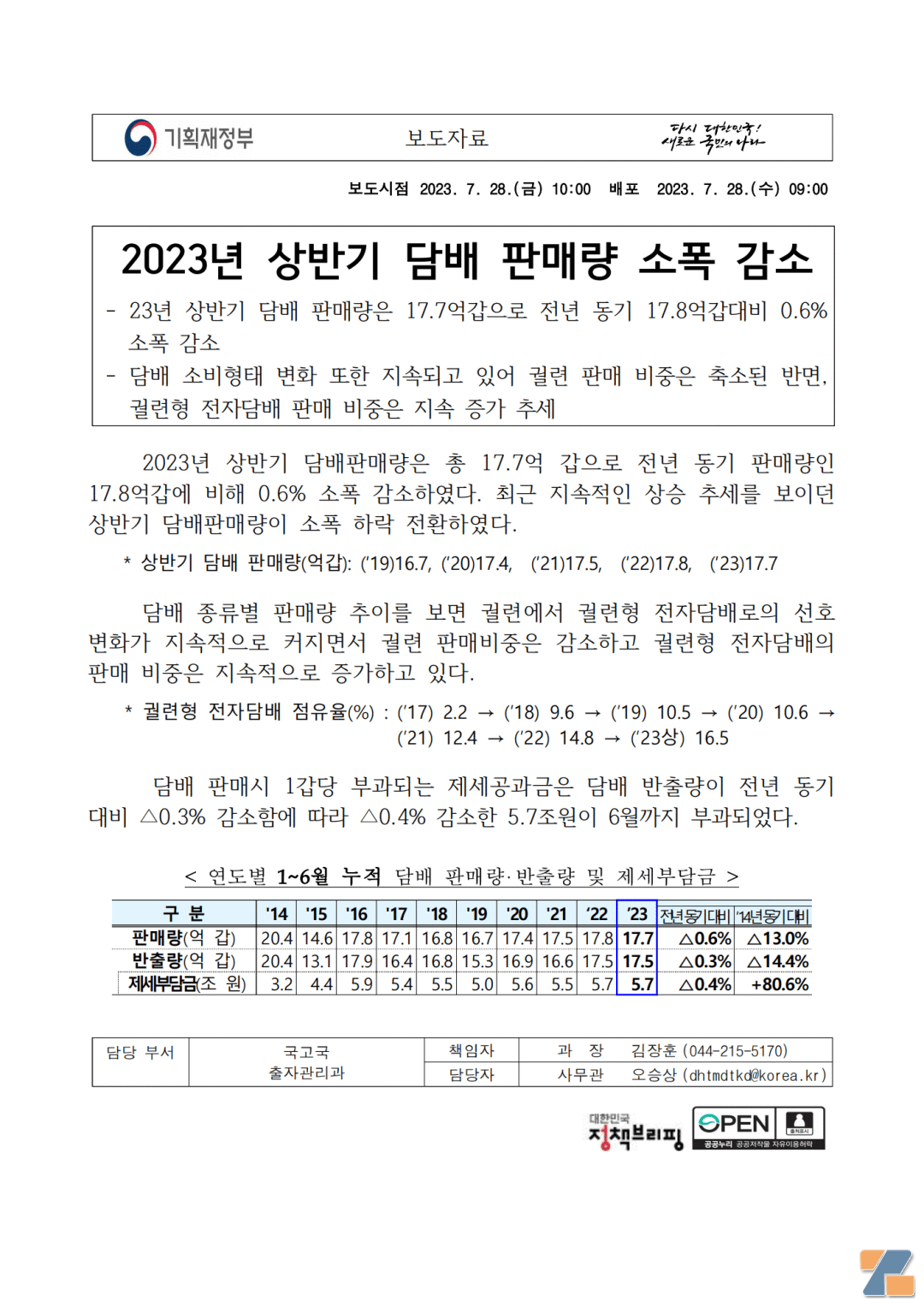 由于2023年上半年烟草出口量同比下降0.3%,与此相应,烟草销售税收也减少了0.4%,至6月累计为5.7万亿韩元。