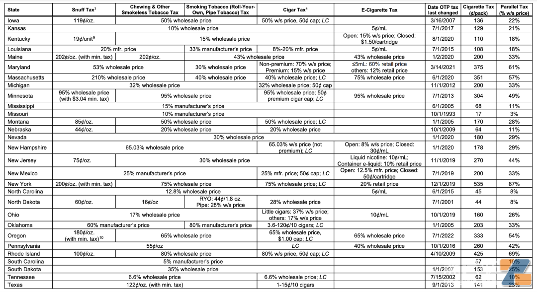 所有州还对咀嚼烟草等非卷烟烟草产品征税。大多数州对“其他烟草产品”按价格的百分比征税,范围从南卡罗来纳州制造商价格的 5% 到明尼苏达州批发价的 95%。然而,一些州对鼻烟和咀嚼烟草等产品征收每盎司税。