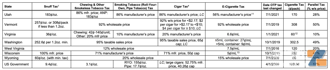 各州和地方政府对各种烟草产品征税,包括香烟、咀嚼烟草和无烟烟草(通常被称为“其他烟草产品”)以及电子烟产品。不同的烟草产品以不同的方式征税:香烟按包征税,其他烟草产品通常按价格的百分比征税,电子烟产品按每盎司电子烟液体或价格的百分比(取决于产品和州)征税。