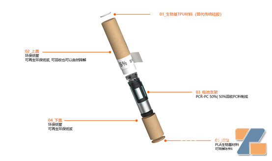 新材料,主要是改变电子烟外壳的材质,如可降解塑料(PLA、PBAT等),循环回收塑料,以及纸管等;
