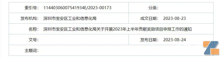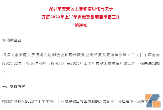 8月24日,深圳市宝安区工业和信息化局发布了《关于开展2023年上半年贡献奖励项目申报工作的通知》。通知称,宝安区工业和信息化局现开展2023年上半年贡献奖励项目申报工作。