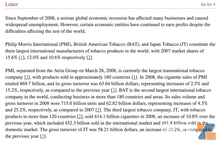 其中提到,2008年,PMI营业额为636.4亿美元,比上年分别增长2.5%和15.2%。英美烟草公司总营业额达到628.2亿美元,比2007年分别增长4.5%和25.2%。日烟国际总营业额为582.1亿美元,比上年增长10.2%。