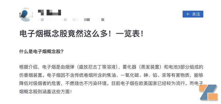 电子烟概念股作为概念,并没有对所有涉及的股票进行明确分类。投资者垂直社交网站雪球的一篇介绍“电子烟概念股”的贴文中,将与电子烟有直接或者间接关联的A股上市企业汇总,得出约有36个企业属于该范畴。