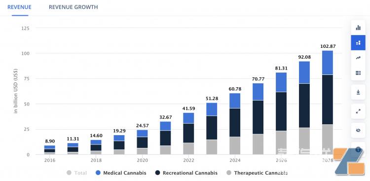 同时该统计也强调,大麻市场的大部分收入将来自美国。