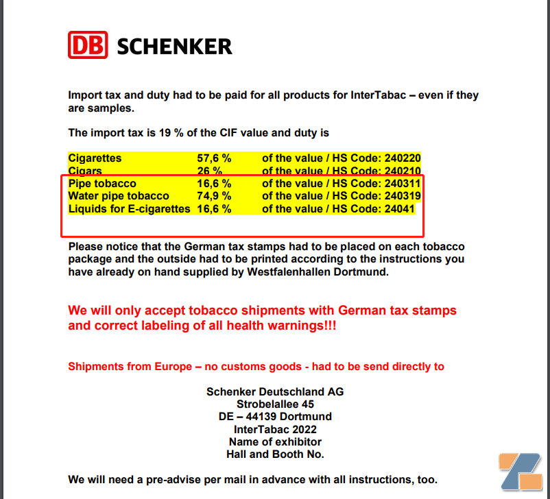 就比如这次多特蒙德会,要求展商所有产品都必须支付进口税和关税,其中电子烟用液体占价值的16.6%,主办方明确表示只接受有德国税章的烟草运输,并正确标注所有健康警告!
