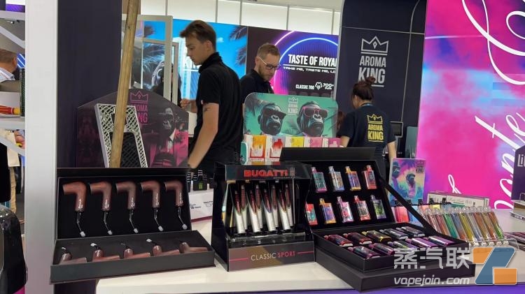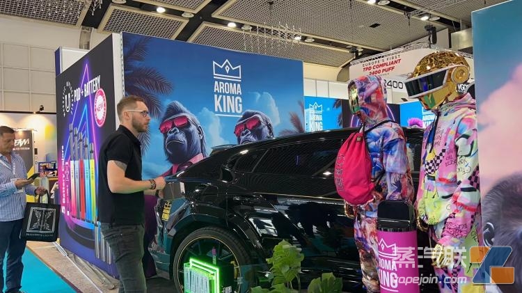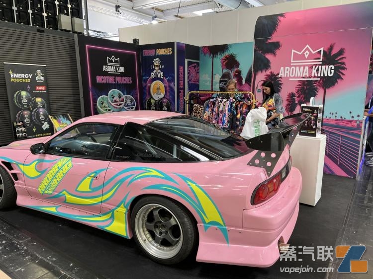 本次多特蒙德烟草展,Aroma King携大口数/小口数、一次性和换弹式产品参展,其展台以跑车文化为特色。