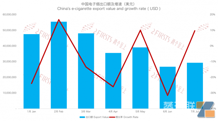 7月中国出口俄罗斯电子烟出口额及增速(美元)|制图:两个至上(蒋明希)