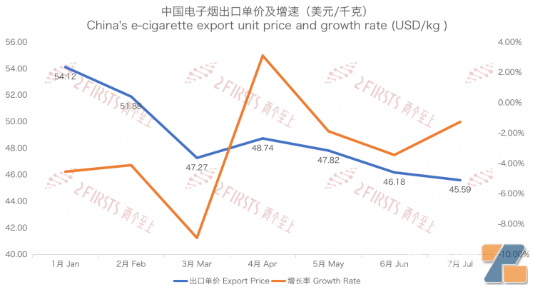 电子烟平均出口单价45.59美元/千克,环比下降1.26%,同比下降25.07%。