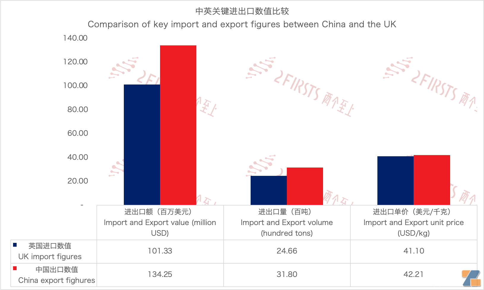 两个至上发现,英国从中国进口额仅为中国出口英国出口额的75.48%,英国从中国进口量仅为中国出口英国出口量的77.53%。