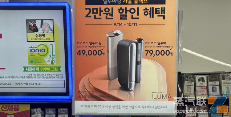 在便利店内,PMI旗下的IQOS Iluma 设备在韩国启动促销优惠。宣传物料图片显示,左边的是Iluma one ,从6.9万韩元降至4.9万韩元(约人民币377元);Iluma 从9.9万降至7.9万韩元(约人民币432元)。