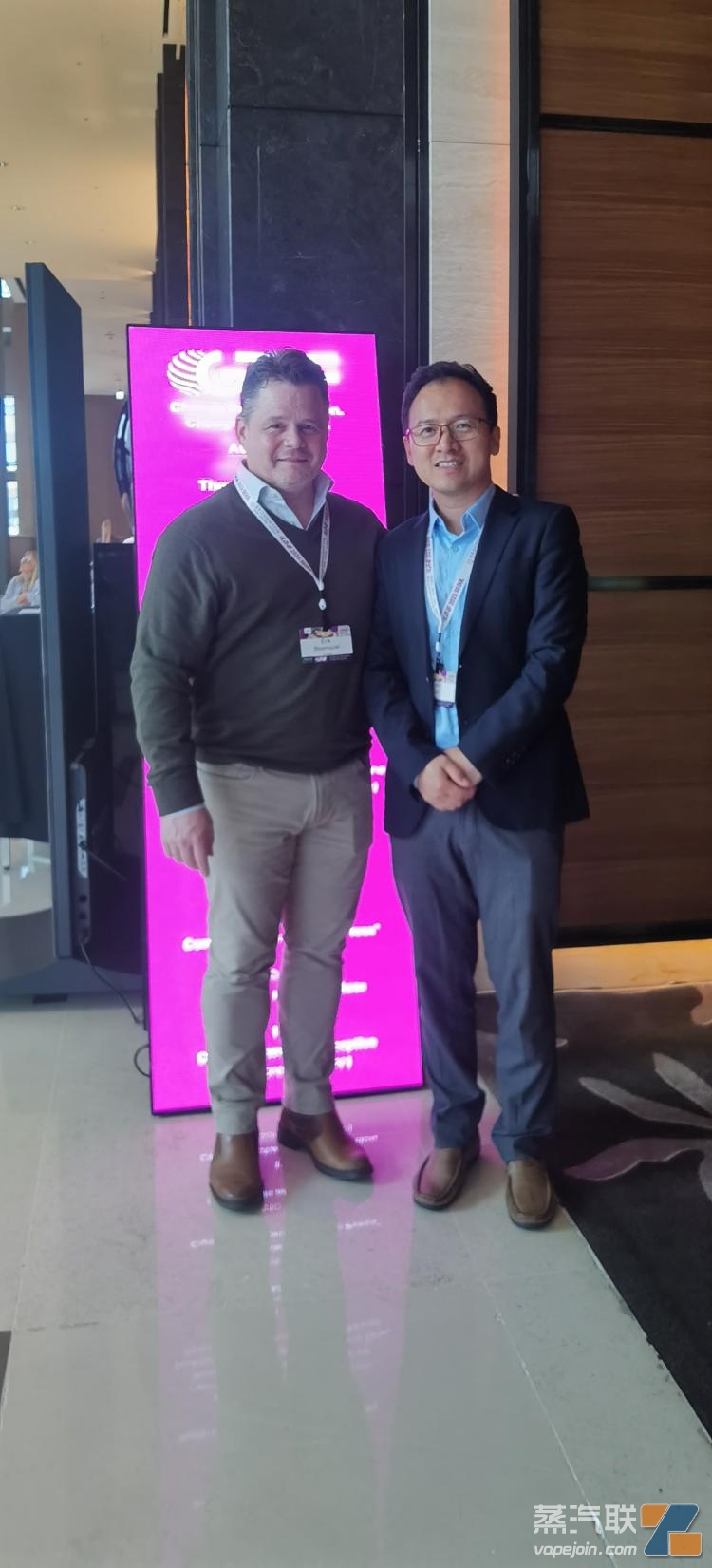 两个至上同全球尼古丁和烟草投资顾问Erik Bloomquist(右一)合影 图源| 两个至上