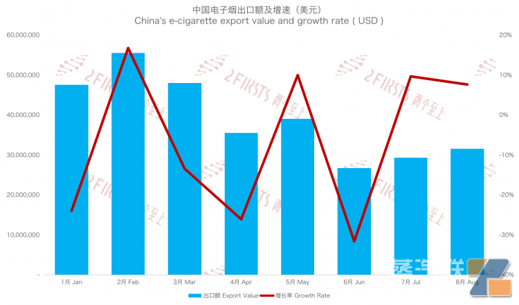8月,中国出口俄罗斯电子烟金额为3155万美元(约合人民币2.31亿元),环比上升7.63%,同比下降34.42%。