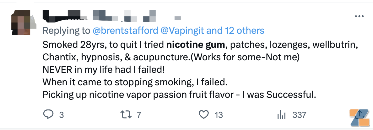 两个至上发现,有部分用户通过Twitter分享了自己使用尼古丁口香糖的体验,有不少用户表示,该产品有助于自己戒烟(卷烟及电子烟)。