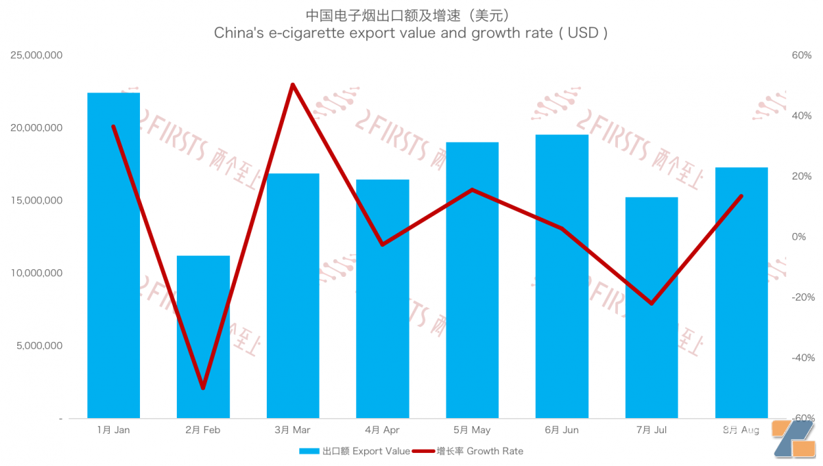 8月,中国出口阿联酋电子烟约为1730万美元,环比增长13.50%,同比增长47.66%。