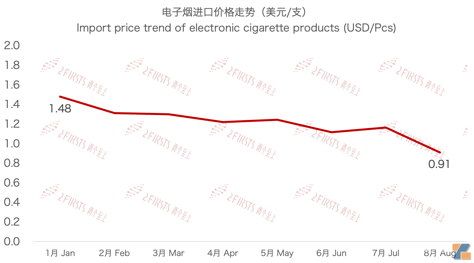 【两个至上原创】10月16日,两个至上从美国国际贸易委员会(United States International Trade Commission)公布的数据获悉,2023年8月,美国进口电子烟6915.3万美元(约5.04亿人民币),电子烟平均进口单价首次跌破1美元/支;中国海关总署公布中国对美国出口电子烟2.52亿美元,而美国国际贸易委员会公布从中国进口电子烟3757.1万美元,仅为中国对美电子烟出口额的14.89%。